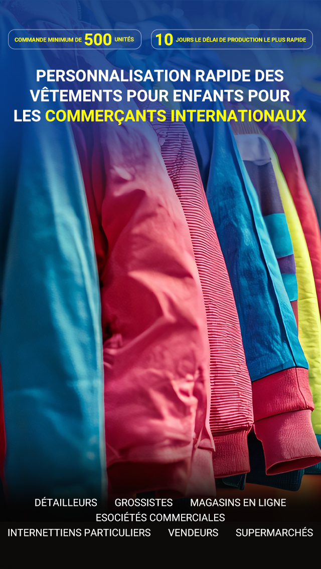 Avec une capacité de production massive, des capacités de conception avancées, une chaîne d'approvisionnement complète et un système logistique efficace, nous nous engageons à fournir des vêtements pour enfants sur mesure de haute qualité aux marchands du monde entier à un prix compétitif.